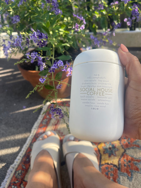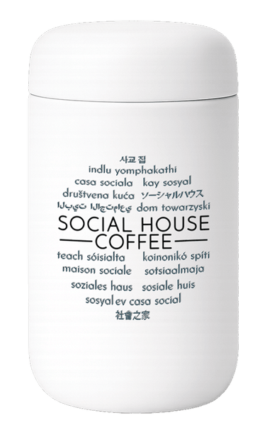 8oz. splash guard Matt white tumbler. Social house in 17 different languages. Inside lined in ceramic.